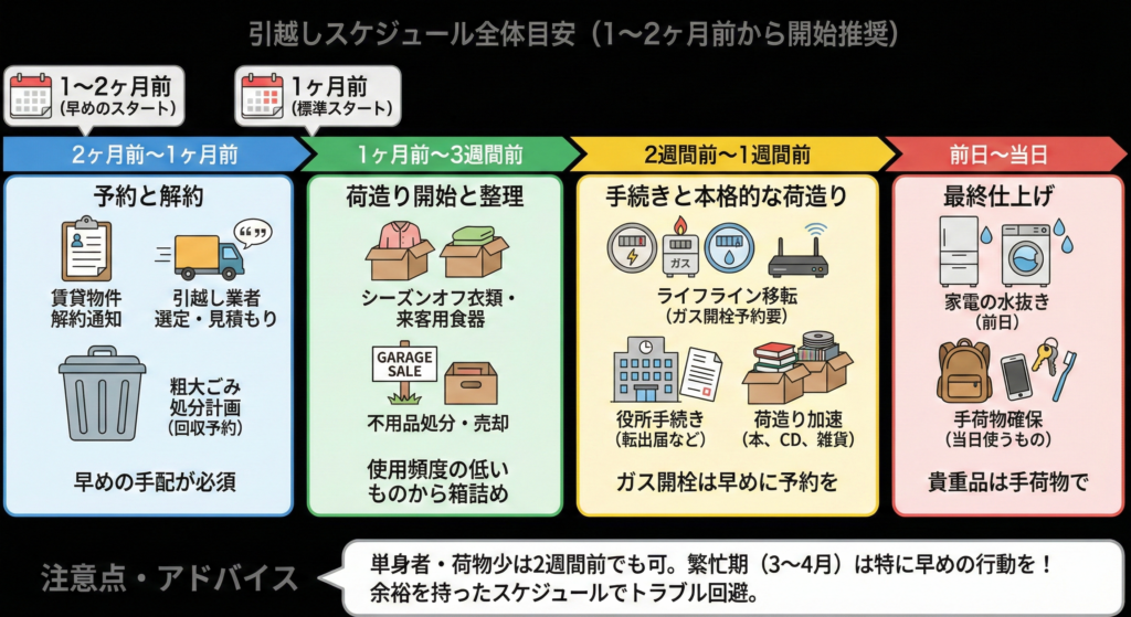 単身者で荷物が少ない場合は2週間前からのスタートでも間に合うことがありますが、余裕を持ってスケジュールを組むことで、直前のトラブルを防ぐことができます。