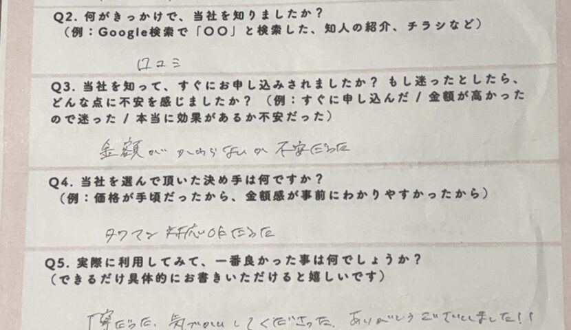 弊社はお客様の信頼を大切にすることで、事業が成長すると信じておりますので、今後も明朗会計にこだわっていきたいと思っています。
